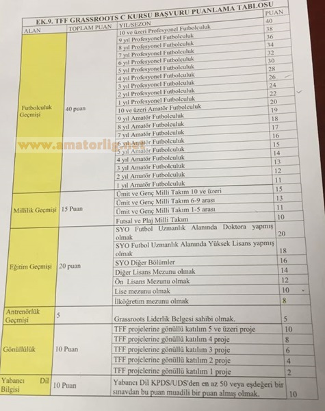 Not: Türkiye Futbol Federasyonu’nun kurallarına göre TFF Grassroots C Futbol Antrenörlüğü Başvuru puanlamasının esasları ekteki evrağa göre hesaplanmaktadır.