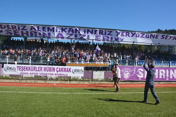 Müsabaka öncesi Hopaspor taraftarlarının yoğun tezahüratları eşliğinde Başkan Nedim Koyuncu ve taraftardan sorumlu yönetici Yaşar Balkaya taraftarları selamladı.
