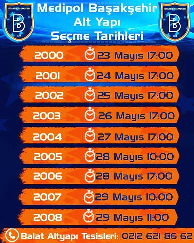 Medipol Başakşehir F.K. Altyapı seçme tarihleri belli oldu. 2000-2008 arası doğumluların katılacağı, güncel sağlık raporunun zorunlu olduğu seçmeler 23-29 Mayıs tarihleri arasında Balat Altyapı Tesisleri’nde yapılacak.