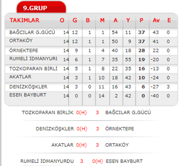 Bağcılar Gençlergücü’nün şampiyon olarak, Ortaköyspor’un da ikinci olarak bir üst lige yükseldiği U19/2 Ligi 9.Grupta bu hafta oynanması gereken Tozkoparan Birlikspor-Bağcılar Gençlergücü, Denizköşkler-Örnektepespor, Akatlarspor-Ortaköyspor ve Rumeli İdmanyurdu-Esen Bayburt maçları, Tozkoparan Birlikspor, Denizköşkler, Akatlarspor ve Esen Bayburt takımlarının ligden çekilmeleri üzerine oynatılmadı.