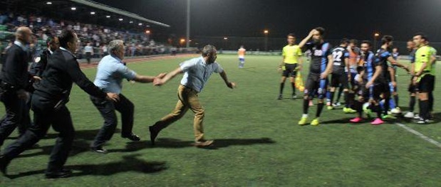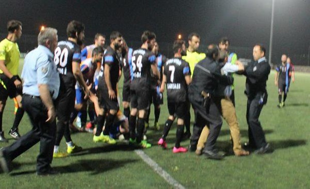 Sakarya’da, amatör küme maçında Hendek Gençlikspor takımının teknik direktörü cezalı olmasına rağmen sahaya girerek hakemin üzerine yürüdü. Karşılaşmanın ardından hakeme tepki göstererek soyunma odasının önünde toplanan Hendek Gençlikspor yöneticileri ve taraftarlarını polis güçlükle yatıştırdı.