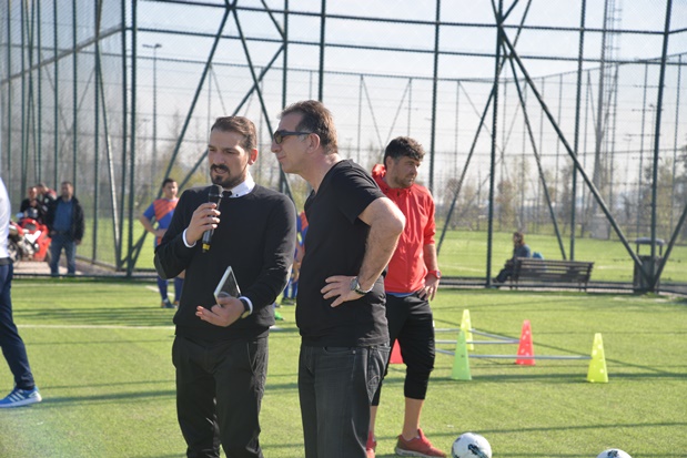 Çalışma öncesi futbolcu adaylarının ailelerine tavsiylerde bulunan tecrübeli futbol adamı Turhan Sofuoğlu genç kramponlara da şut çekmenin tüyolarını uygulamalı olarak anlattı.