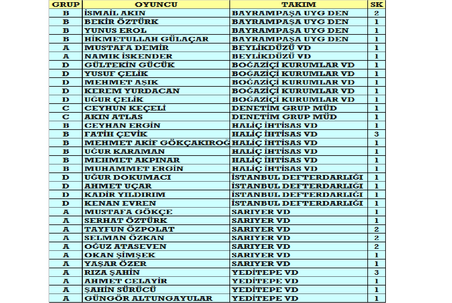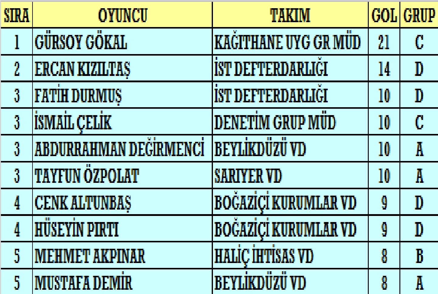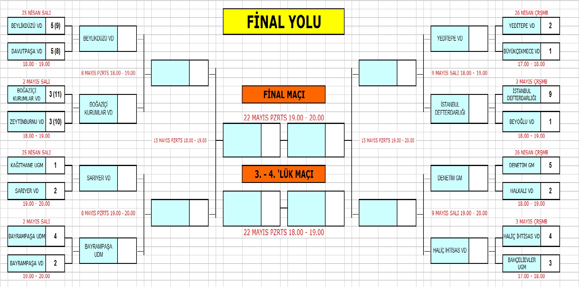 9 Mayıs Salı günü oynanacak ilk maçta Yeditepe Vergi Dairesi turnuvanın en çok gol atan takımı İstanbul Defterdarlığı karşısında sürpriz yapmak isterken, günün ikinci maçında Haliç İhtisas Vergi Dairesi ile Denetim Grup Müdürlüğü yarı finale çıkabilmek için kozlarını paylaşacak.