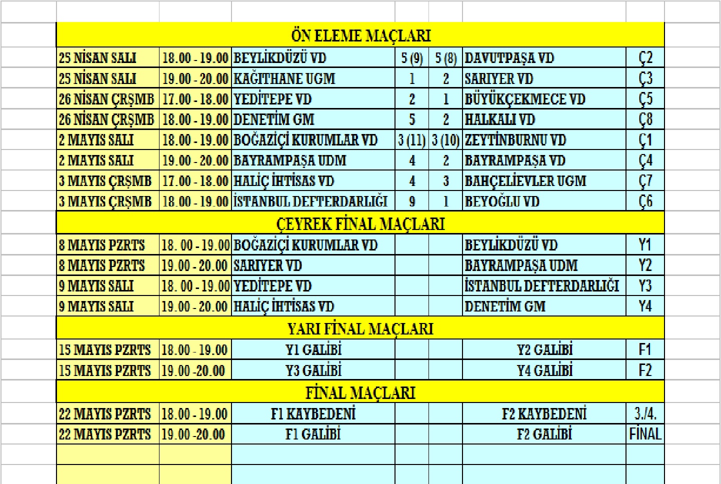 8 Mayıs Pazartesi günü geçen senenin şampiyonu Boğaziçi Kurumlar Vergi Dairesi ile Beylikdüzü Vergi Dairesi çeyrek finalin ilk maçında karşı karşıya gelecek. Aynı gün Bayrampaşa Uygulama Denetim Müdürlüğü turnuvanın formda takımı Sarıyer Vergi Dairesi karşısında yarı final vizesi almaya çalışacak.