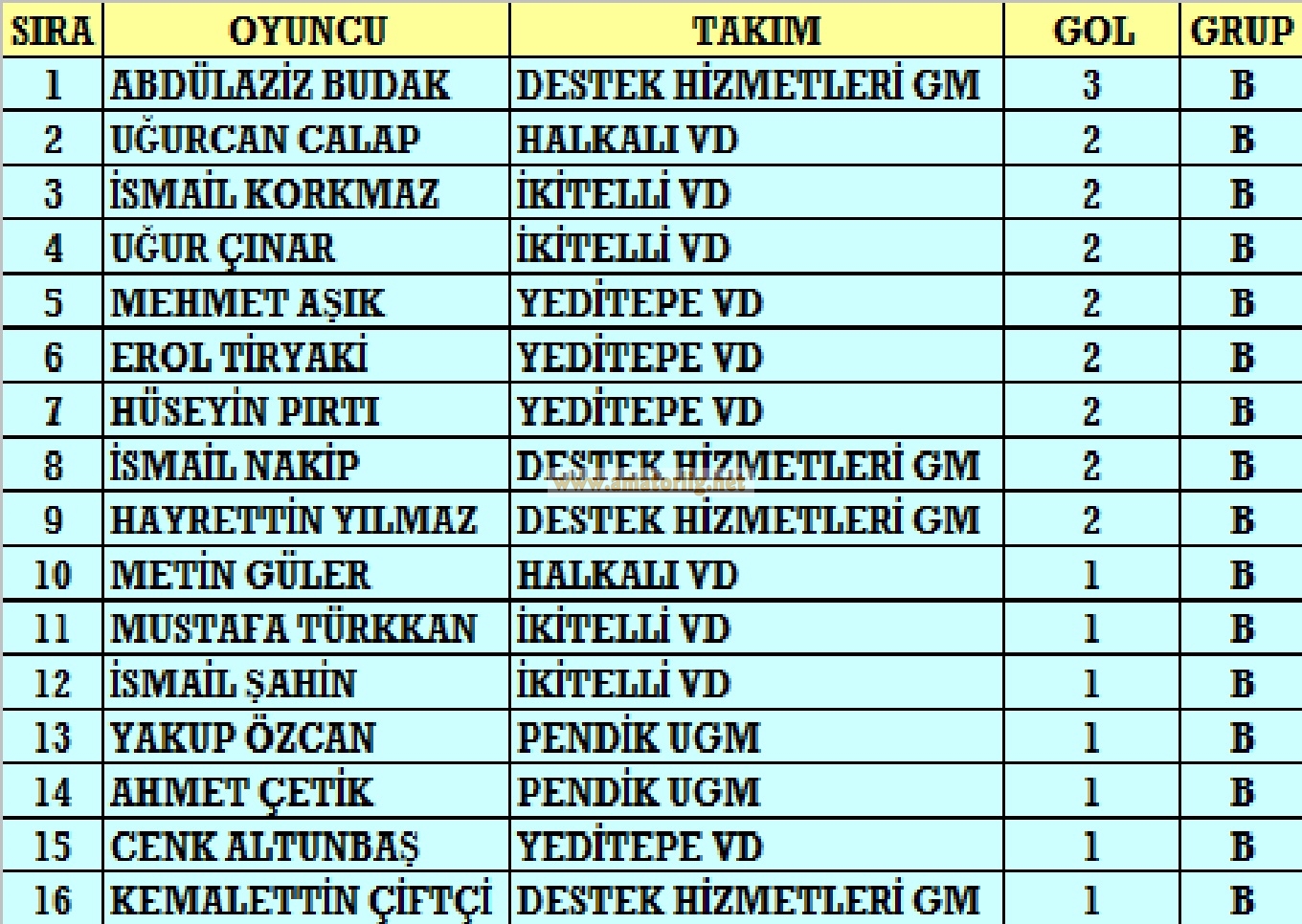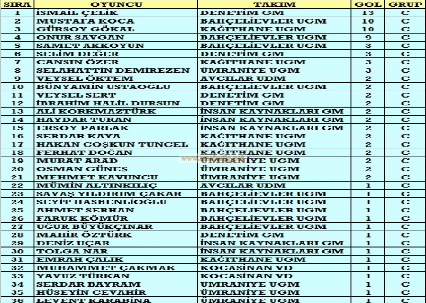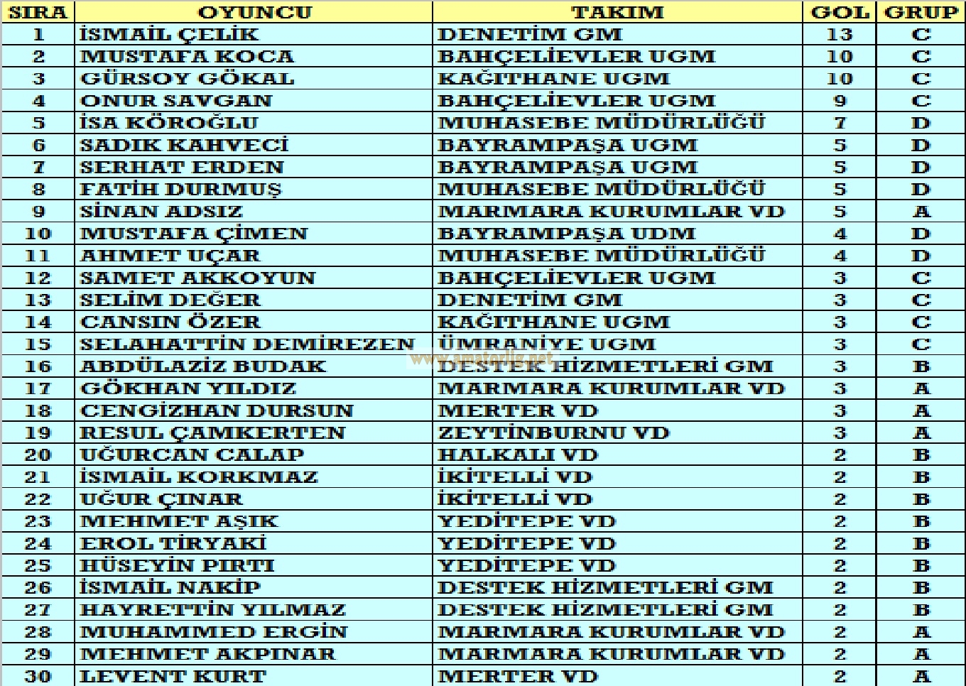 – Turnuvanın en çok gol atan oyuncuları C Grubu’ndan çıktı; Denetim GM’den İsmail 13 golle 1. sırada yer alırken, 10 gollü Gürsoy (Kağıthane UGM) ve Mustafa (Bahçelieler UGM) 2. sırayı paylaştılar. 3. sırada yine bir Bahçelievler UGM oyuncusu Onur 9 golle zirve yarışının içinde yer aldı.