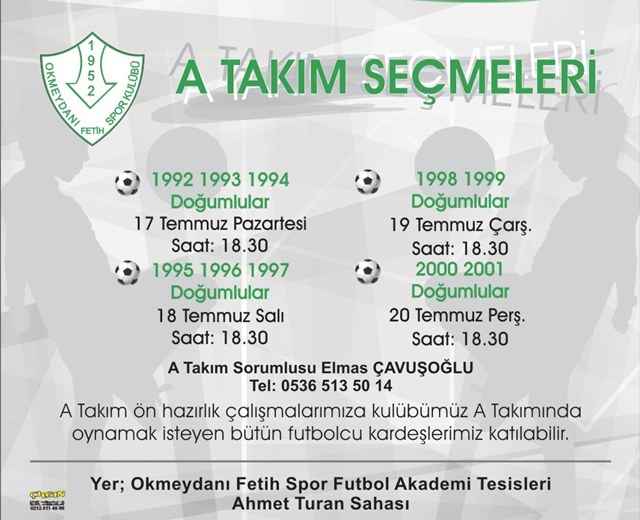 Okmeydanı Fetihspor Teknik Sorumlu Elmas Çavuşoğlu gözetiminde yapılacak olan seçmeler, 1992, 1993 ve 1994 doğumlu oyuncular 17 Temmuz 2017 Pazartesi günü saat 18.30’da, 1995,1996 ve 1997 doğumlu sporcular 18 Temmuz 2017 Salı günü, 1998 ve 1999 doğumlular 19 Temmuz 2017 Çarşamba günü ve 2000 ila 2001 doğumlu futbolcu adayları ise 20 Temmuz Perşembe günü saat 18.30’da yapılacak.