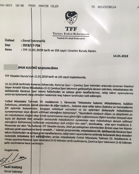 FMT’nın 19. Maddesinin 1. Fıkrasına göre verilen ve Genel Sekreter Yardımcısı Kadir Kardaş imzalı evrakta, “müsabakanın Kanaryaspor takımı futbolcularının ve sahaya giren taraftarlarının Çamlıcasporlu oyuncuları darp ettiğinden dolayı Çamlıcaspor’un 3-0 hükmen galip gelmesine karar verilmiştir” denildi.