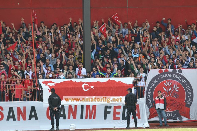 8 bin Fatih Karagümrük taraftarı maç soyunca hiç susmadılar. Maçtan önce dağıtılan Türk bayrakları ile sürekli olarak “şehitler ölmez, vatan bölünmez” sloganları atan Karagümrük taraftarlarına Stadı görev evlerden de büyük destek geldi.
