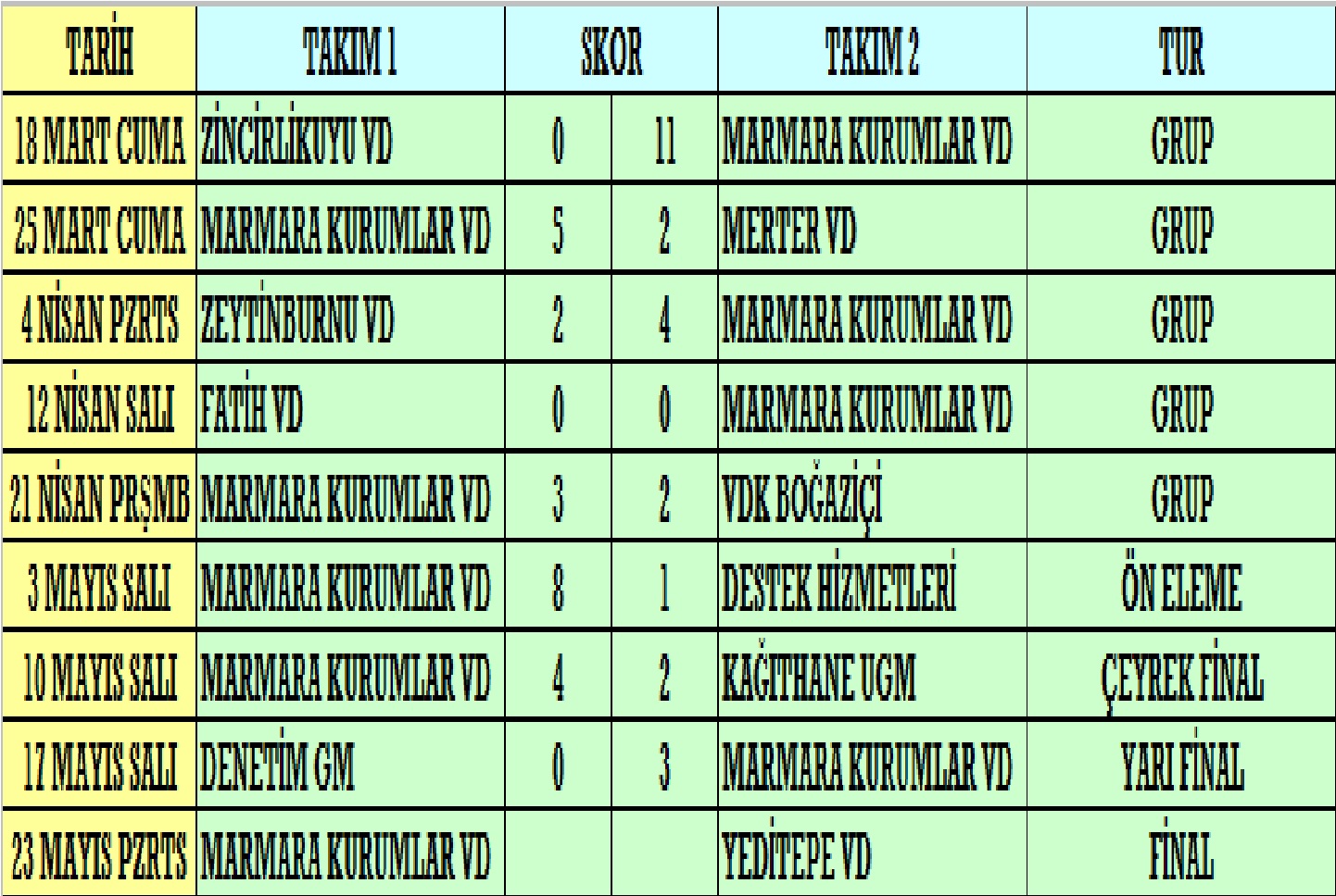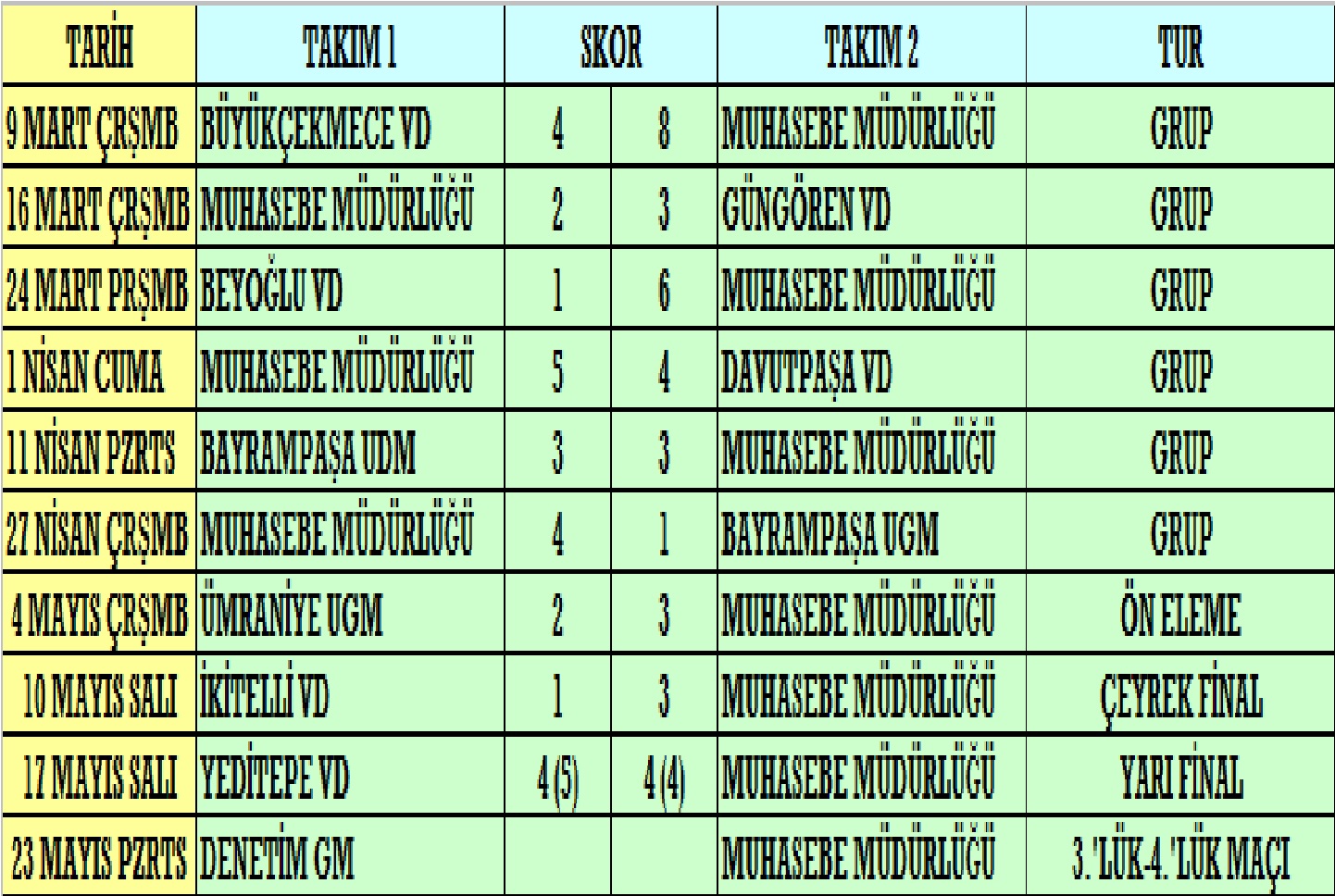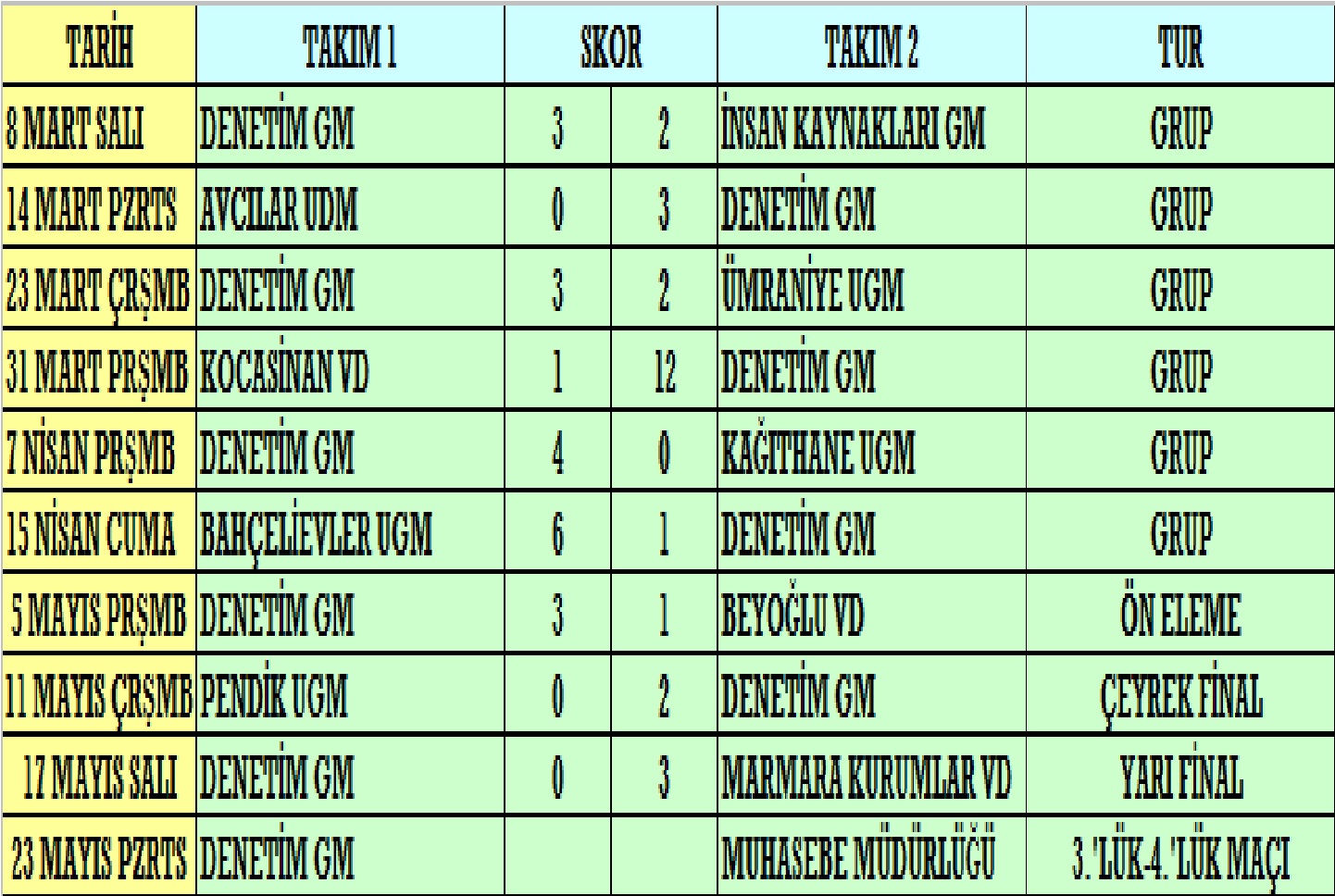 23 Mayıs Pazartesi günü oynanacak olan Marmara Kurumlar VD – Yeditepe VD final maçı ile son bulacak olan turnuvada aynı gün Denetim GM – Muhasebe Müdürlüğü arasında da turnuva 3.’lük maçı oynanacak. Turnuvada bugüne kadar 2005 yılında 1 kez şampiyonluk yaşayan Marmara Kurumlar VD ile bu sevinci 2002 ve 2003 yıllarında üst üste 2 kez yaşayan Yeditepe VD arasında oynanacak olan final maçının yanı sıra, turnuvada pek çok farklı isimle mücadele ederek tam 6 kez şampiyon olma başarısını gösteren Denetim GM ile bu sene turnuvada sürpriz yaparak ilk 4 takım arasına girmeyi başaran Muhasebe Müdürlüğü mücadelesi de kıran kırana geçecek.