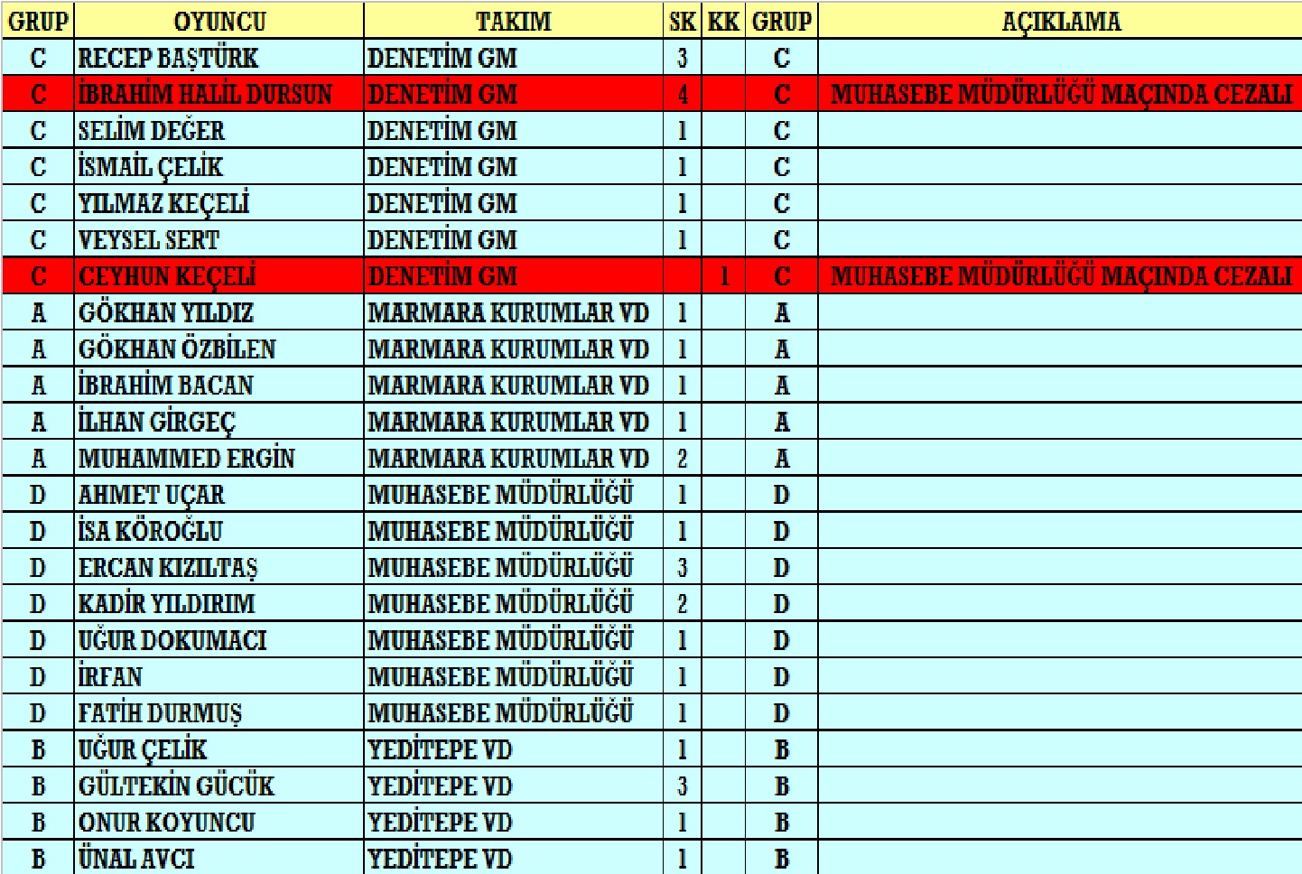 Turnuvada final oynayacak olan Marmara Kurumlar VD ile Yeditepe VD’nin ve 3.’lük maçında karşılaşacak olan Denetim GM ile Muhasebe Müdürlüğü’nün bugüne gelene kadar yapmış oldukları maçlar ile bu dört takımın kart ceza tablosundaki durumları ve gol krallığı tablosuna haberimizin devamında yer alan görsellerden ulaşabilirsiniz.
