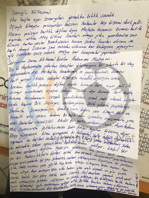 “Sevgili Ali Kemal öncelikle kolay gelsin. Her hafta aynı senaryoları görmekten bıktık usandık. Ofsaytı bilmeyen pozisyonları kaçıran hakemler her hafta bize mi denk gelir? ‘Hocam pozisyon kartlık değil mi? diyen Mustafa hocamızı kırmızı kart ile oyundan attılar. Maç bitimi lisansları almaya giden yöneticimize ‘sen kimsin kimlik göster’ deyip yöneticimizin de ‘hocam lisansları alacağım’ demesi üzerine ben ‘binbaşının yeğeniyim hepinizi aldırırım’ gibi kelimeler sarf etmeler mafya mı bunlar hakem mi Ali Kemal?