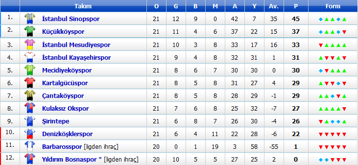Küme düşenler: Kadırgaspor, Tuzla Şifaspor, Yıldıztabyaspor