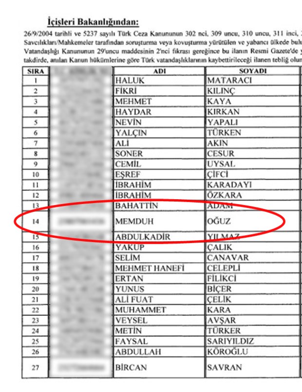 Türkiye Cumhuriyeti vatandaşlığından çıkarılma ilanı bugün Resmi Gazetede yayımlandı. Listede toplamda 130 kişi bulunuyor. Resmi Gazetede yayımlanan listede Türkiye Amatör Spor Kulüpleri Konfederasyonu (TASKK) Disiplin Kurulu Üyesi firari Avukat Memduh Oğuz da bulunuyor.