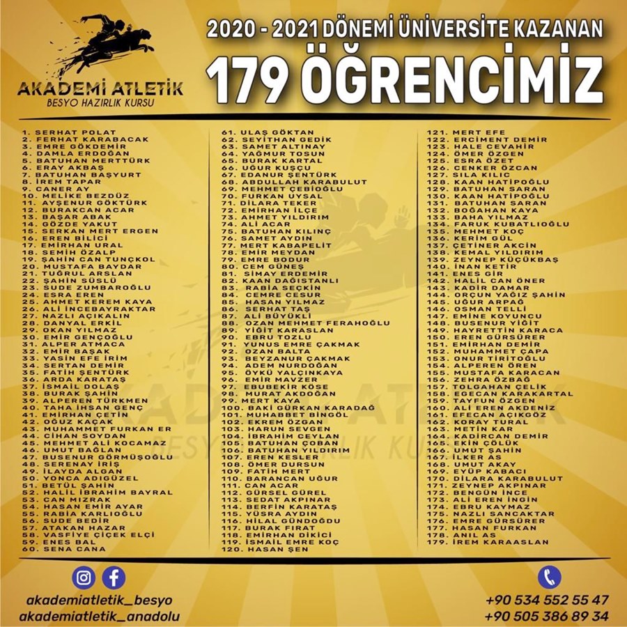 Akademi Atletik son 8 senede 1165 öğrenciye Üniversite kazandırarak en çok Üniversite kazandıran kurs olmuştur ve %100 başarı oranı sağlamıştır.