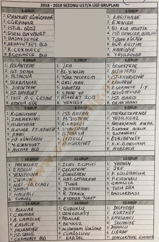 İstanbul 2018-2019 sezonu U17/A Ligi grupları belli oldu. İstinye’deki Orhan Saka Amatörler Evi’nde çekilen kura neticesinde gruplar şu şekilde oluştu.